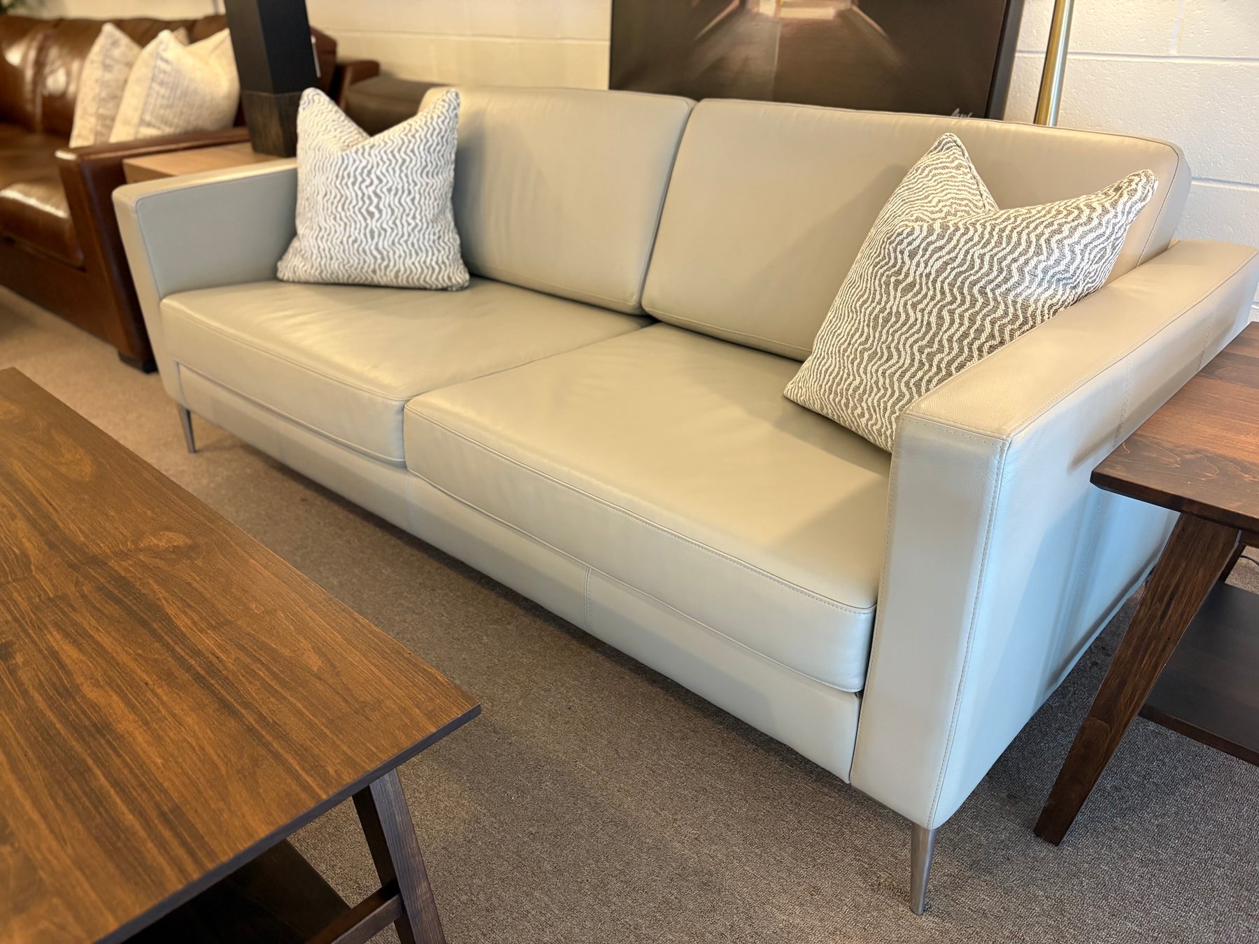 The Kensington Collection boasts transitional style with a simple silhouette that will complement any living space. Locally built with solid wood frames, high density foam and upholstered in premium top grain leather. Available with a sleek metal leg or classic wooden tapered leg. Available with loose backs or a tight channeled back. Available as a sofa, loveseat, chair or sofa chaise. Hundreds of top grain leathers or fabrics to choose from.