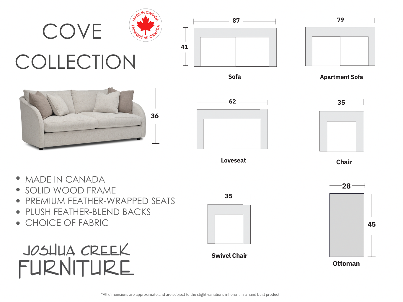 The Cove Collection features a modern curved arm and plush feather blend seats and backs. Made in Canada with solid wood framing and high density foam with  your choice of fabric. Available as a sofa, condo sofa, loveseat, chair and swivel chair.